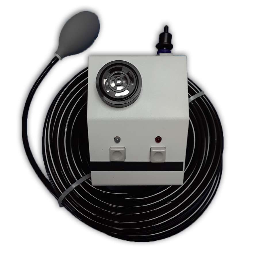 The Magnacoustics MagnaAlarm provides a simple, reliable way for patients to alert MRI technologists during a scan. Designed for use outside the magnetic field, the MagnaAlarm unit connects to a hand squeeze bulb that is placed with the patient inside the scanner room. If the patient experiences discomfort, anxiety, or claustrophobia, a quick squeeze activates the alarm in the control room—immediately alerting the technologist to stop the scan and respond.